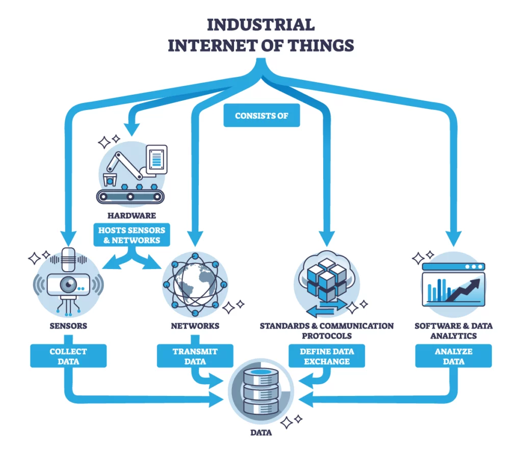 - Industrial IoT software turning that data into real-time dashboards, alerts, and analytics.
